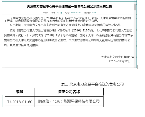 天津电力交易中心关于天津市第一批售电公司公示结果的公告