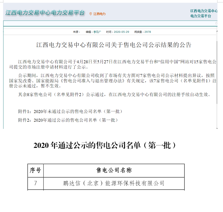 公示期间,江西电力交易中心有限公司收到了市场有关方面对7家售电公司公示材料提出异议,按照国家发改委、国家能源局《售电公司准入与退出管理办法》有关规定,该7家售电公司(名单见附件1)注册公示未通过,暂不生效。