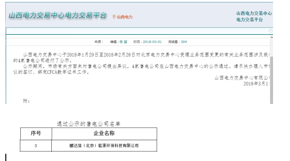 山西电力交易中心于2018年1月29日至2018年2月28日对北京电力交易中心受理业务范围变更的有关业务范围涉及我省的4家售电公司进行了公示。