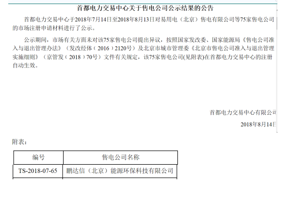 首都电力交易中心于2018年7月14日至2018年8月13日对易用电(北京)售电有限公司等75家售电公司的市场注册申请材料进行了公示。