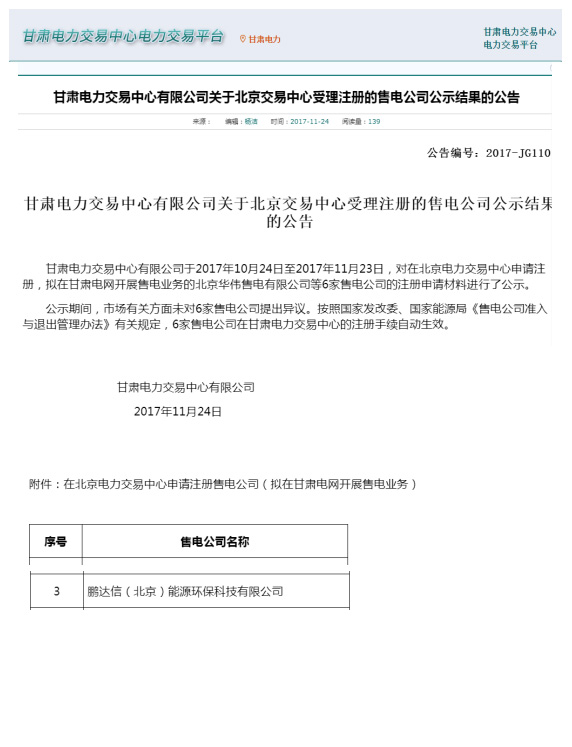 甘肃电力交易中心有限公司于2017年10月24日至2017年11月23日,对在北京电力交易中心申请注册,拟在甘肃电网开展售电业务的北京华伟售电有限公司等6家售电公司的注册申请材料进行了公示。