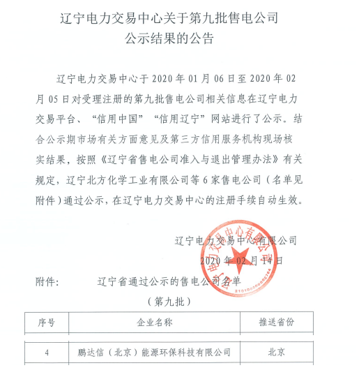 辽宁电力交易中心关于售电公司注册信息变更公示结果的公告(公告编号:J20200113)